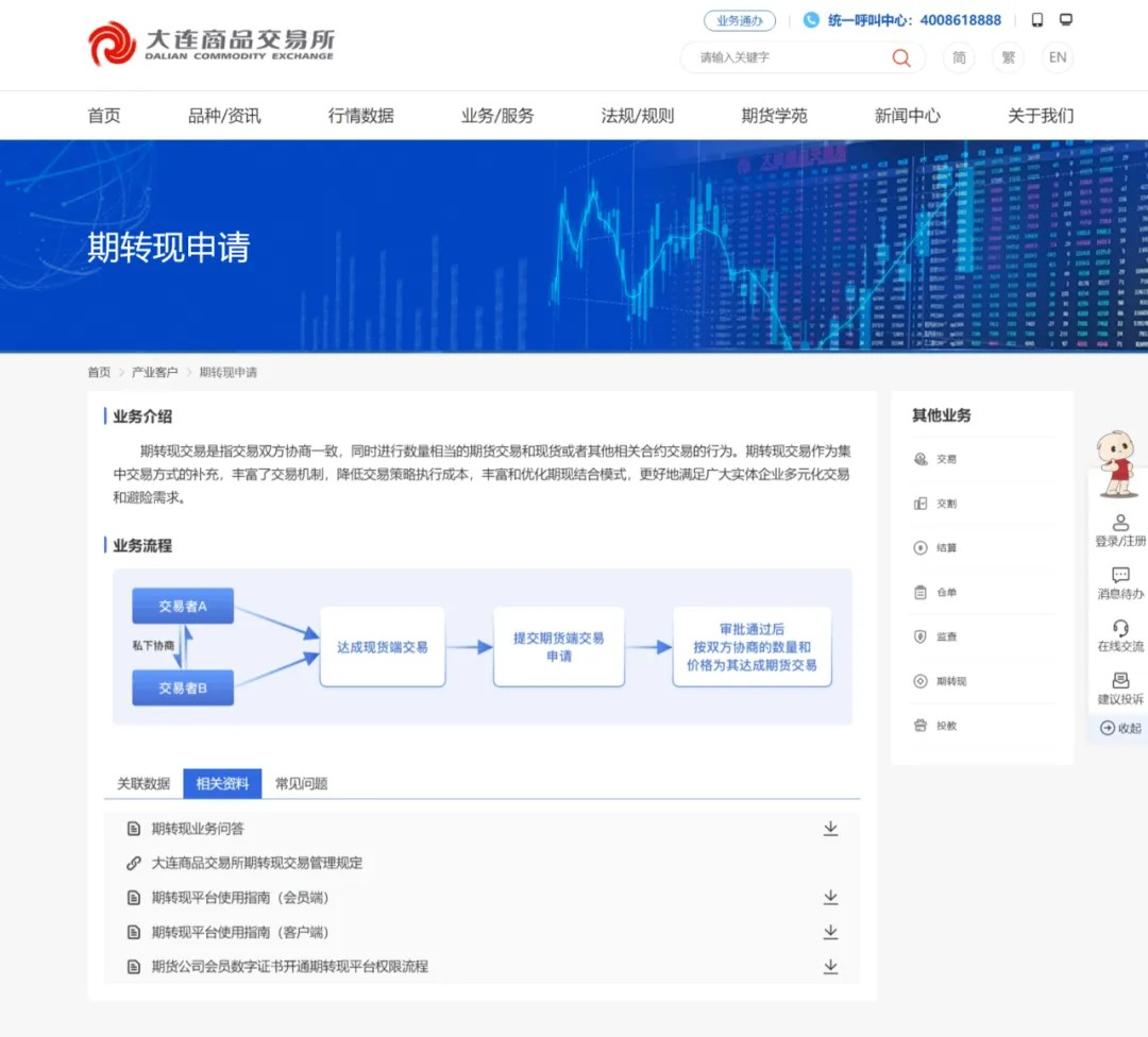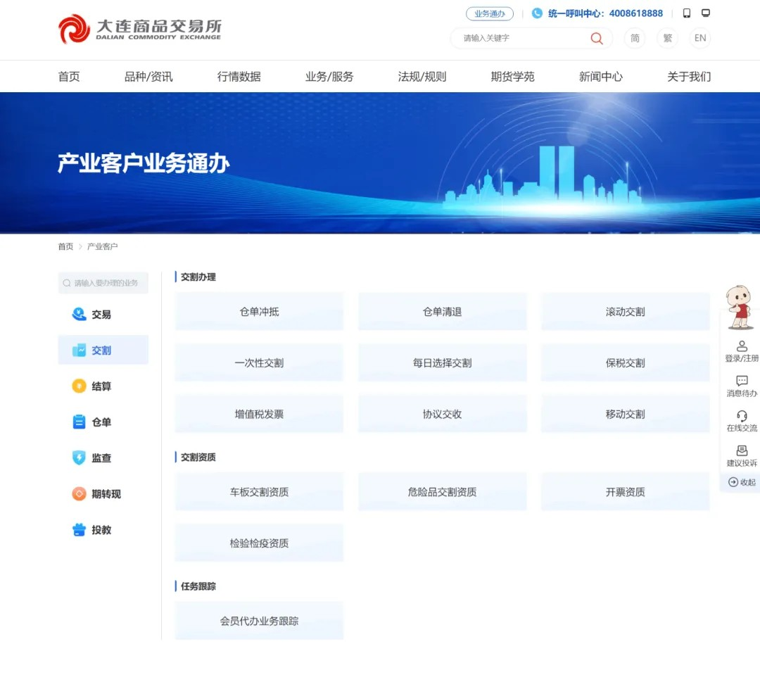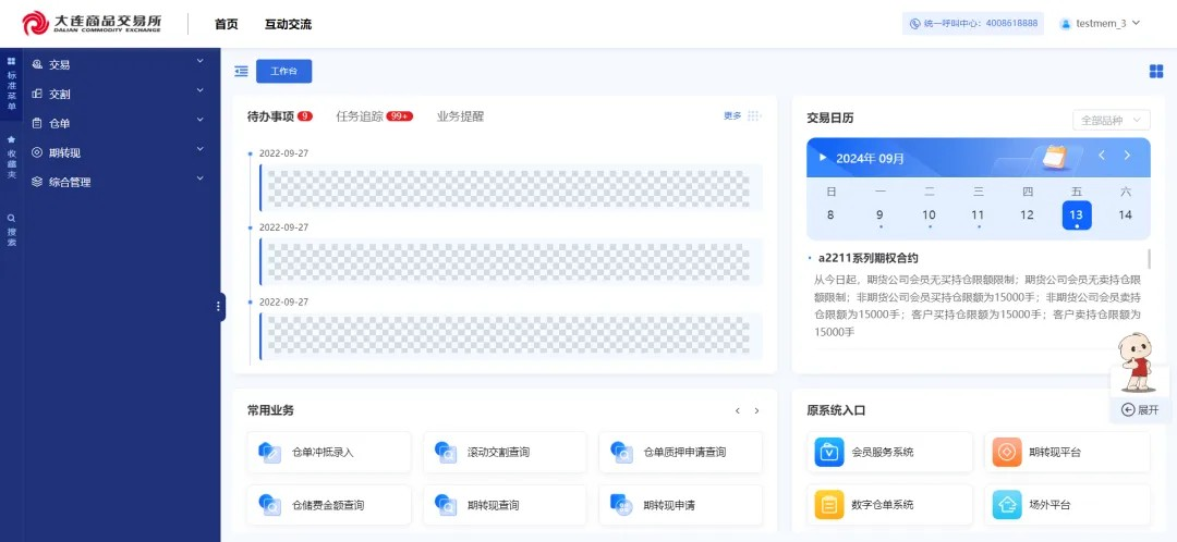 大商所对外门户将数字仓单、期转现、场外交易等业务系统进行了整合。用户可在一个统一的界面上轻松处理各种业务,无需在不同系统间切换,极大提升了业务办理效率,便利业务办理。