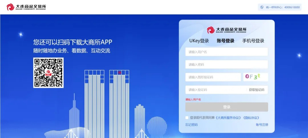 除了功能上的整合,大商所对外门户还打通了各业务系统的账户体系。各业务系统的老用户们仍可使用原业务系统账户登录。对于没有业务账户的客户群体,可点击登录页右下角的“账户注册”按钮前往注册页面。