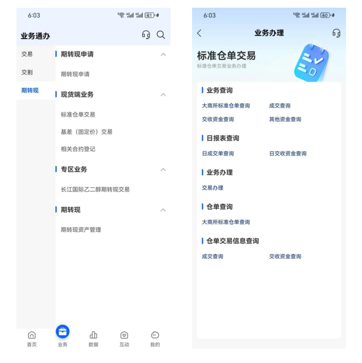 大商所对外门户APP端推出了移动业务办理服务,共上线200+业务办理功能,覆盖交割、仓单、期转现的高频业务办理功能,打破了传统业务办理的时空限制,使得业务操作更加灵活便捷。