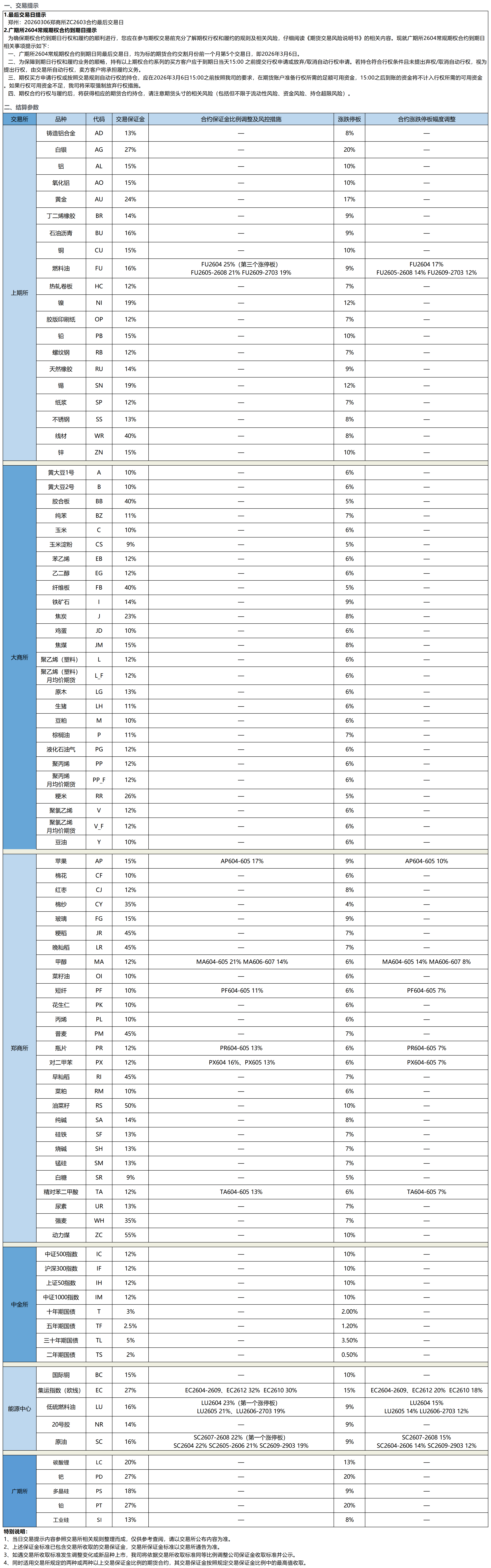 各品种交割信息
